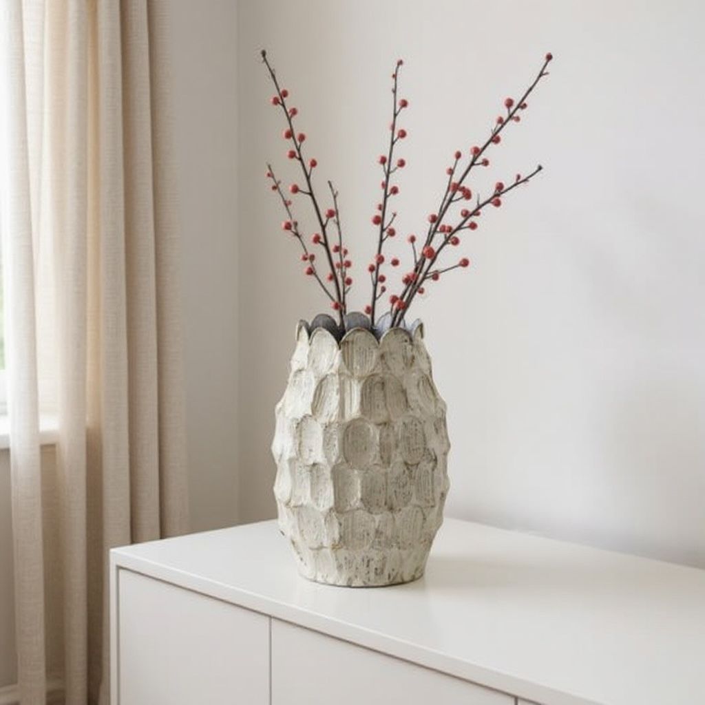 Perfect voor een paar decoratieve takken, een bos droogbloemen of gewoon als object op zichzelf. De matte finish en organische details zorgen voor een natuurlijke look die past bij landelijke, romantische of Scandinavische woonstijlen.