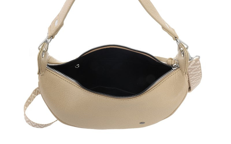 Ben je op zoek naar een tas die direct opvalt en toch makkelijk elke dag te dragen is? Dan is de Quebec in natuurlijke tint echt een schot in de roos. De populaire halvemaanvorm geeft deze tas een moderne uitstraling en zorgt meteen voor dat beetje extra in je outfit. Dankzij de zachte beige tint combineer je haar moeiteloos met neutrale kleuren, denim en zwart, waardoor je er steeds weer anders mee kunt stylen.