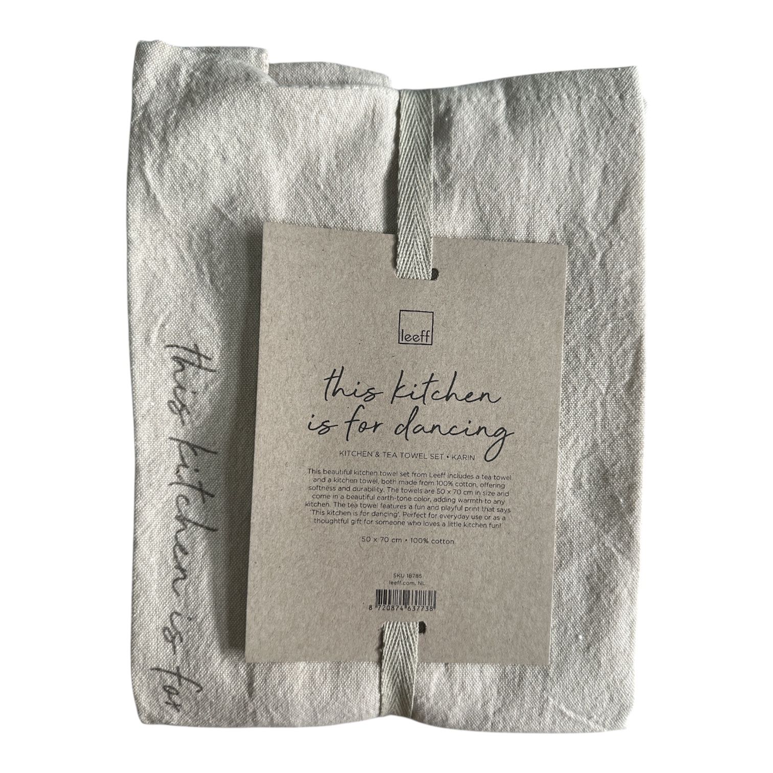 Breng vrolijkheid in de keuken met deze stijlvolle keukenset van Leeff. De set bestaat uit een theedoek met de speelse tekst This kitchen is for dancing en een bijpassende handdoek. Gemaakt van 100% zacht katoen in een warme natuurlijke tint, waardoor ze niet alleen mooi ogen, maar ook heerlijk absorberend zijn.