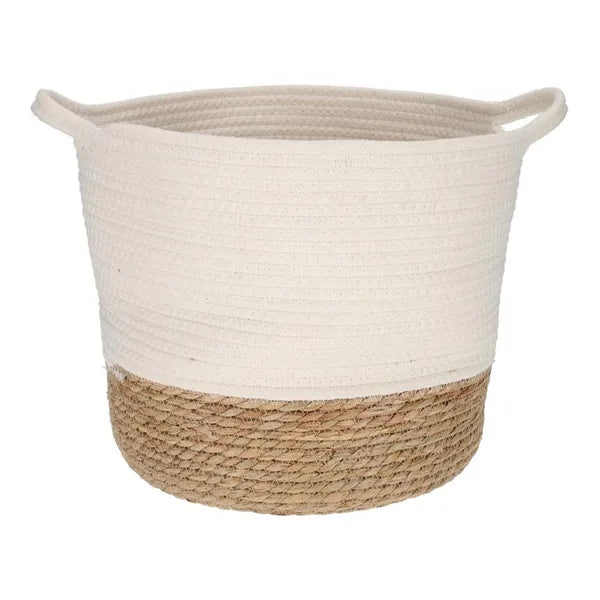 Multifunctionele opbergmand gemaakt van een combinatie van katoen en lisdodde riet De ruime binnenkant biedt voldoende opbergruimte voor allerlei spullen terwijl het natuurlijke materiaal een warme en gezellige sfeer creert Ideaal voor in de woonkamer slaapkamer of kinderkamer Geef je interieur een natuurlijke touch met deze veelzijdige mand