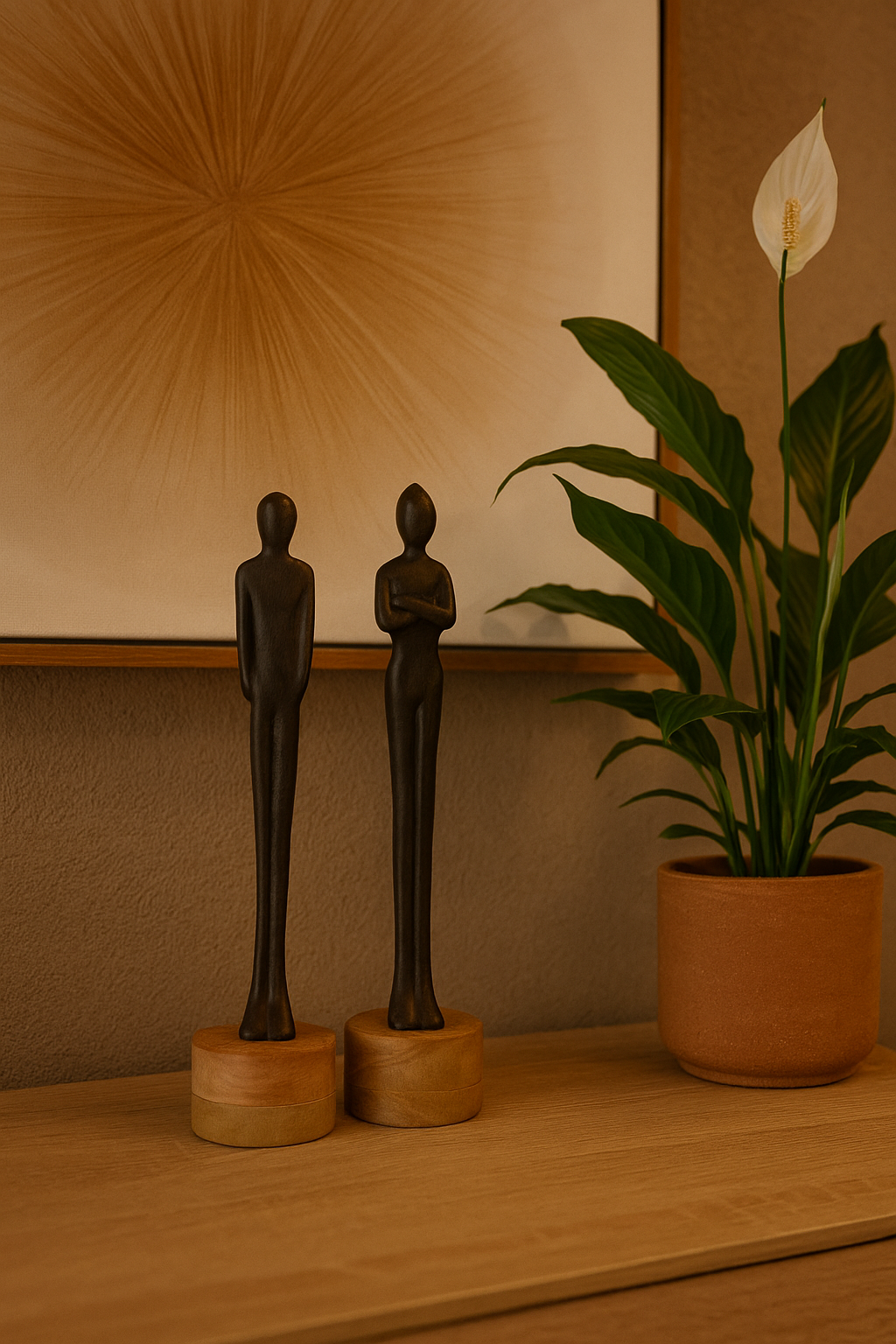 De Ornamenten set Figuro bestaat uit twee elegante figuren die kunst en eenvoud combineren. De beelden zijn gemaakt van aluminium en geplaatst op een voet van warm mangohout, wat zorgt voor een prachtig contrast tussen strak en natuurlijk. De minimalistische vormen geven deze set een moderne en kunstzinnige uitstraling.