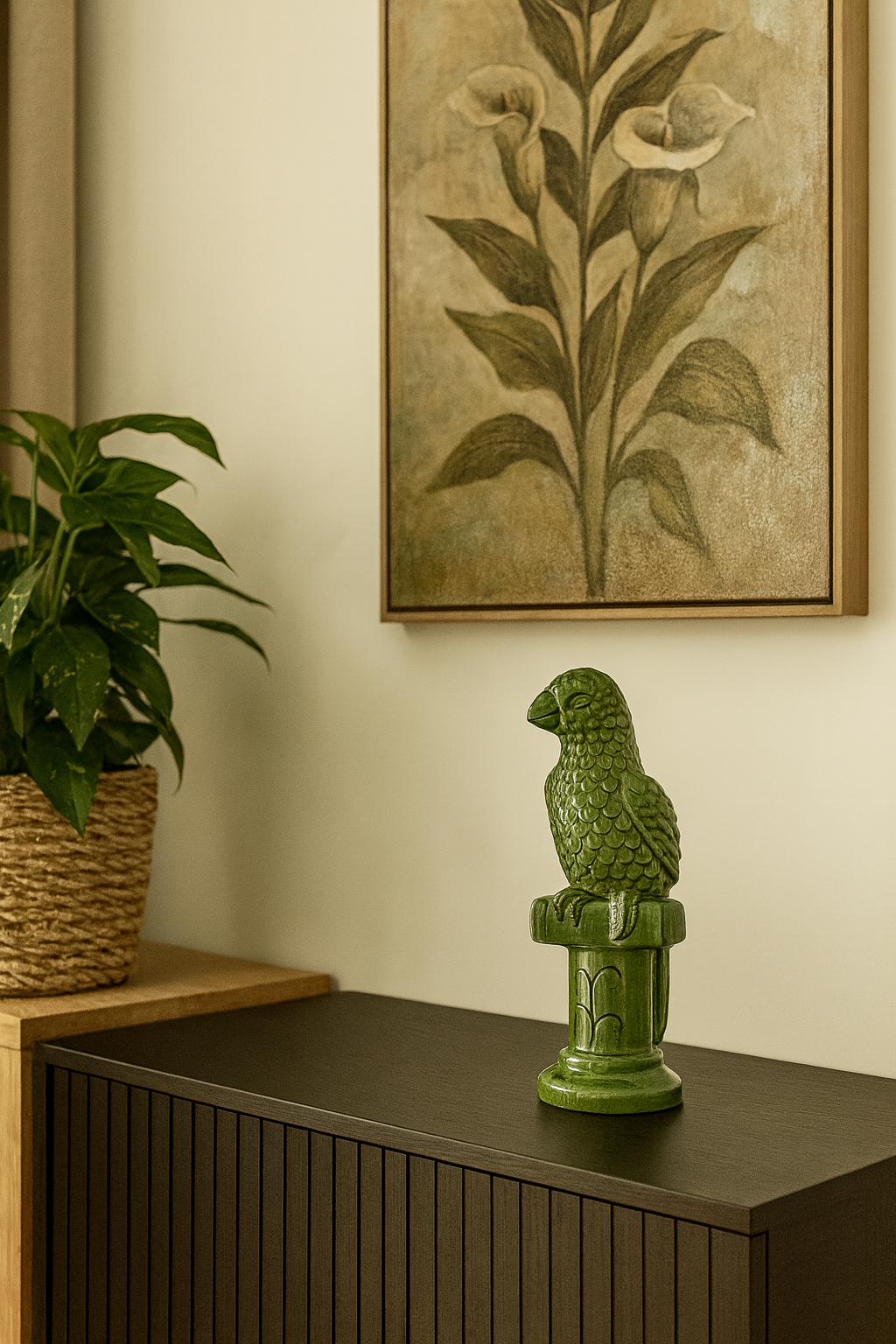 Het Ornament Papegaai Liora voegt een speels en tropisch accent toe aan je interieur. Dit sierlijke beeld van keramiek is afgewerkt in een diepe groene glazuur die prachtig glanst en meteen opvalt. De papegaai zit statig op een zuil met subtiel patroon, wat het ornament een elegante uitstraling geeft.