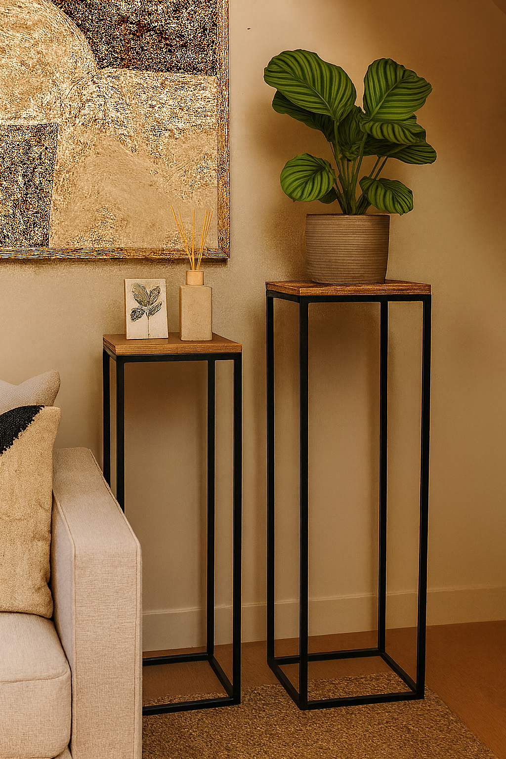 Deze set van twee hoge plantenstandaards combineert strak met stoer: een zwart metalen frame met een robuust houten blad. De maten van de tafeltjes zijn 27x27x77 cm en 23x23x69 cm. Perfect voor het stijlvol presenteren van planten, vazen of andere decoratie.