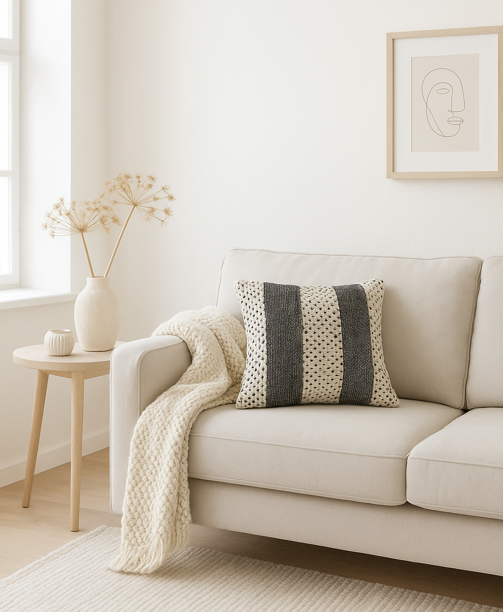 Breng sfeer en warmte in je interieur met het sierkussen Boho Streep. Het kussen is gemaakt van katoen en heeft een prachtig geweven patroon in zwart en wit. De brede strepen en grove structuur geven een stoere, maar tegelijk knusse uitstraling die moeiteloos past in een bohemian of modern interieur.