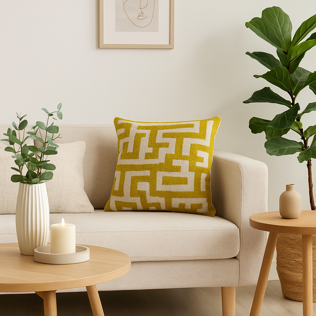 Laat je interieur stralen met het sierkussen Maze Sun. Het kussen van 45x45 cm combineert een speels doolhof-patroon met een zonnig geel en fris wit kleurenpalet. Het vrolijke design maakt dit kussen tot een echte blikvanger, ideaal om je bank, stoel of bed een frisse en energieke uitstraling te geven. De zachte stof zorgt daarnaast voor extra comfort, zodat stijl en gezelligheid perfect samenkomen.