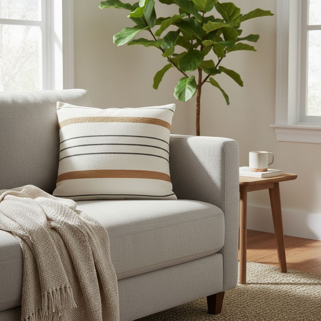 Het sierkussen Nordic Streep heeft een frisse en moderne uitstraling door de strakke strepen in zwart en zandkleur op een lichte basis. De combinatie van natuurlijke tinten en het minimalistische patroon maakt dit kussen een perfecte aanvulling voor een Scandinavisch, modern of bohemian interieur.