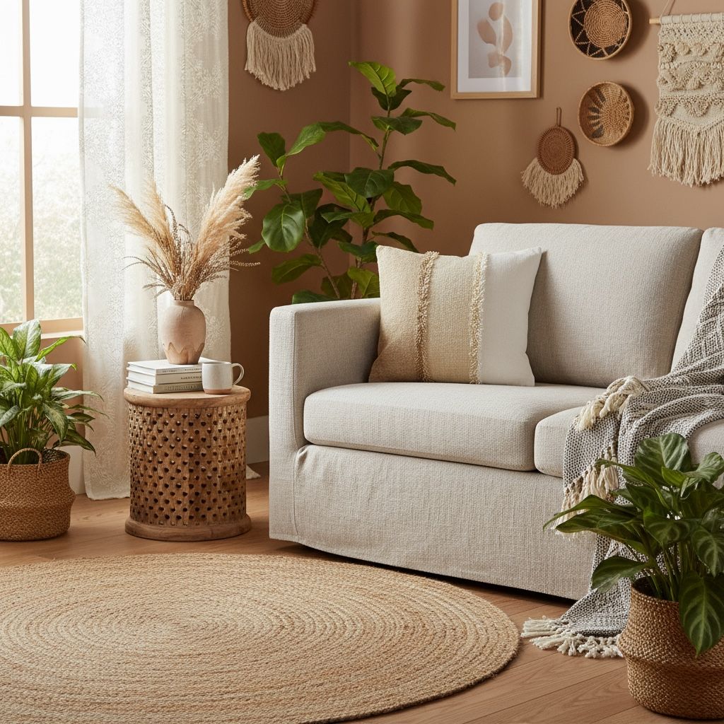 - Design: Neutrale tinten met verticale banen en franjes, perfect voor een moderne of landelijke stijl.