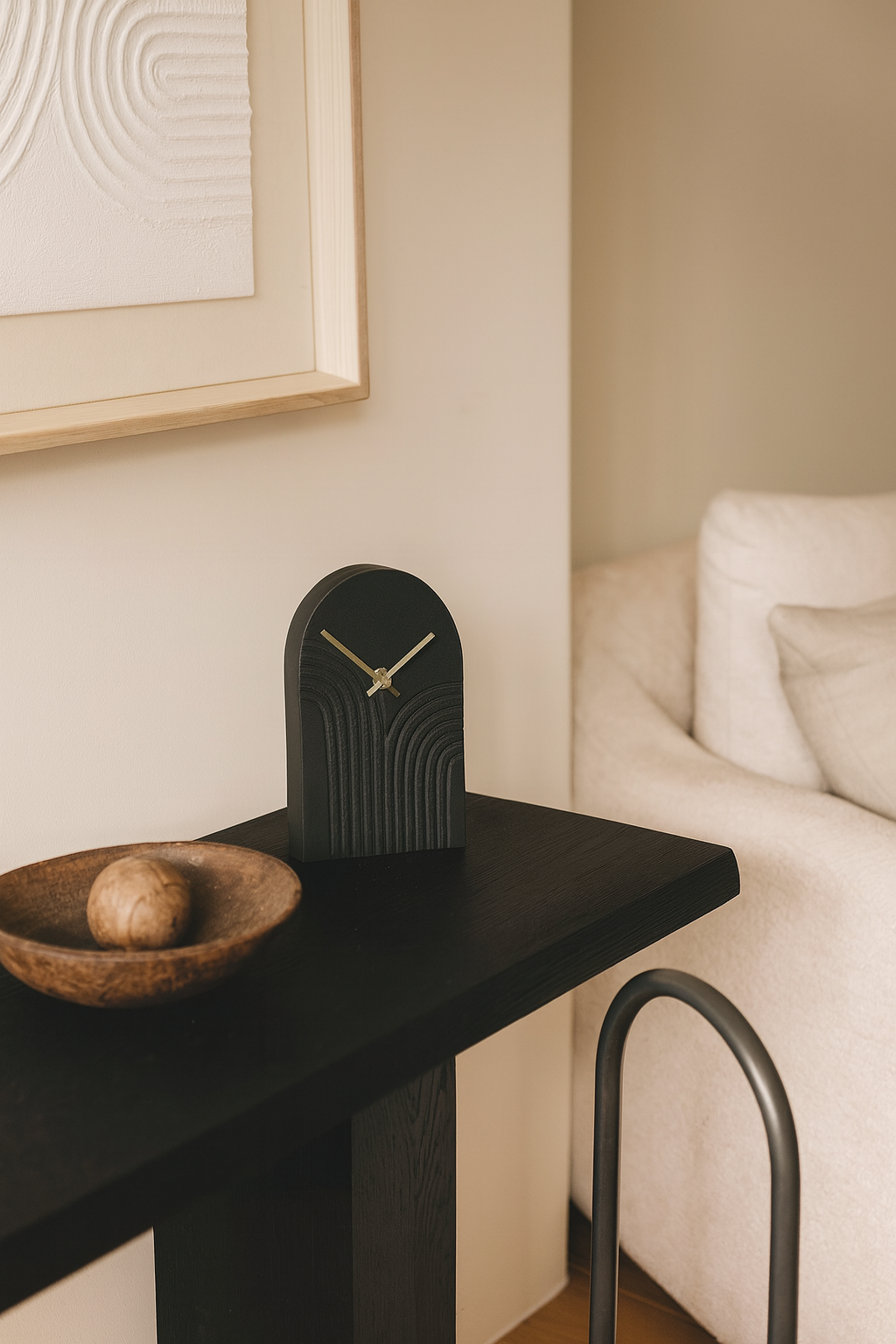 De Tafelklok Arco Zwart is zowel functioneel als decoratief en geeft je interieur een stijlvol en eigentijds accent.