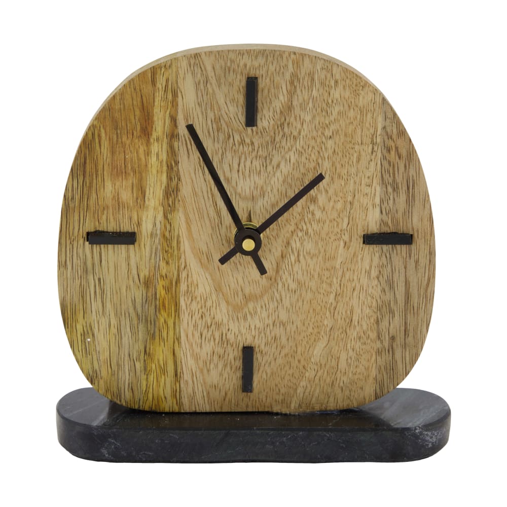 Deze stijlvolle tafelklok is een echte blikvanger voor in huis. De wijzerplaat is gemaakt van warm mangohout, dat met zijn natuurlijke nerven een unieke uitstraling geeft. De stevige voet van zwart marmer zorgt voor een luxe en tijdloze basis. Dankzij het minimalistische ontwerp met strakke wijzers en subtiele tijdsaanduiding past deze klok moeiteloos in zowel een modern als een klassiek interieur.