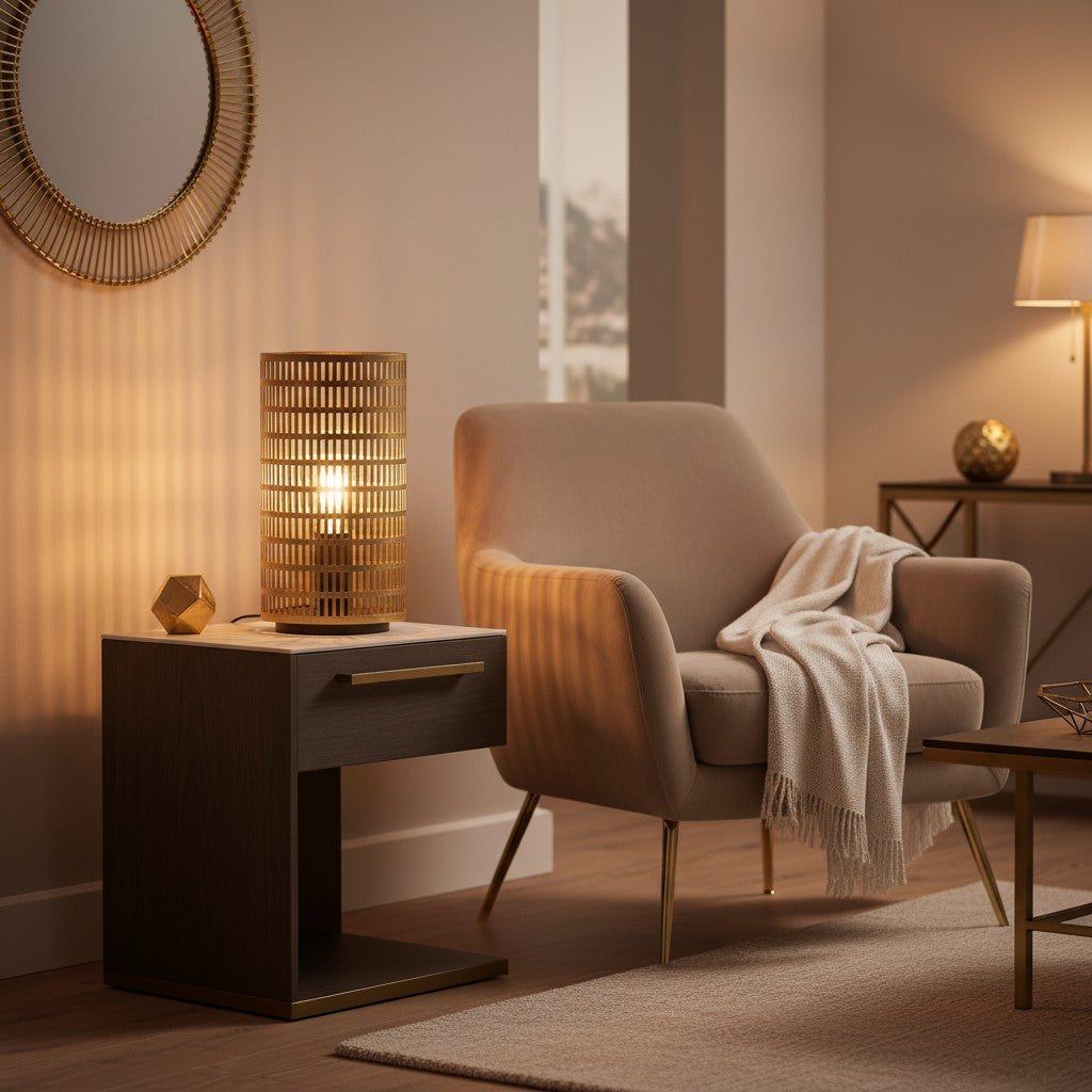 De tafellamp Riva brengt warmte en elegantie in elke kamer. Het cilindervormige metalen design in goudkleur straalt een moderne, chique sfeer uit en laat het licht op een speelse manier door de opengewerkte structuur schijnen. Hierdoor ontstaat een subtiel schaduwspel dat direct gezelligheid toevoegt aan je interieur.
