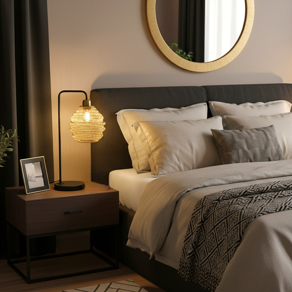 De tafellamp Vento in goud straalt warmte en elegantie uit. De bijzondere metalen kap met een fijn gevlochten structuur zorgt voor een zacht, sfeervol lichteffect dat elke ruimte direct gezelliger maakt. De combinatie van het goudkleurige draadwerk met de matzwarte voet geeft de lamp een chique uitstraling met een moderne twist.