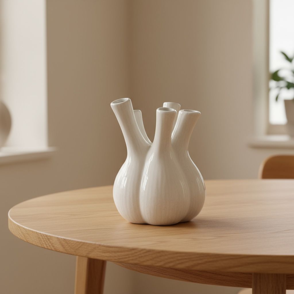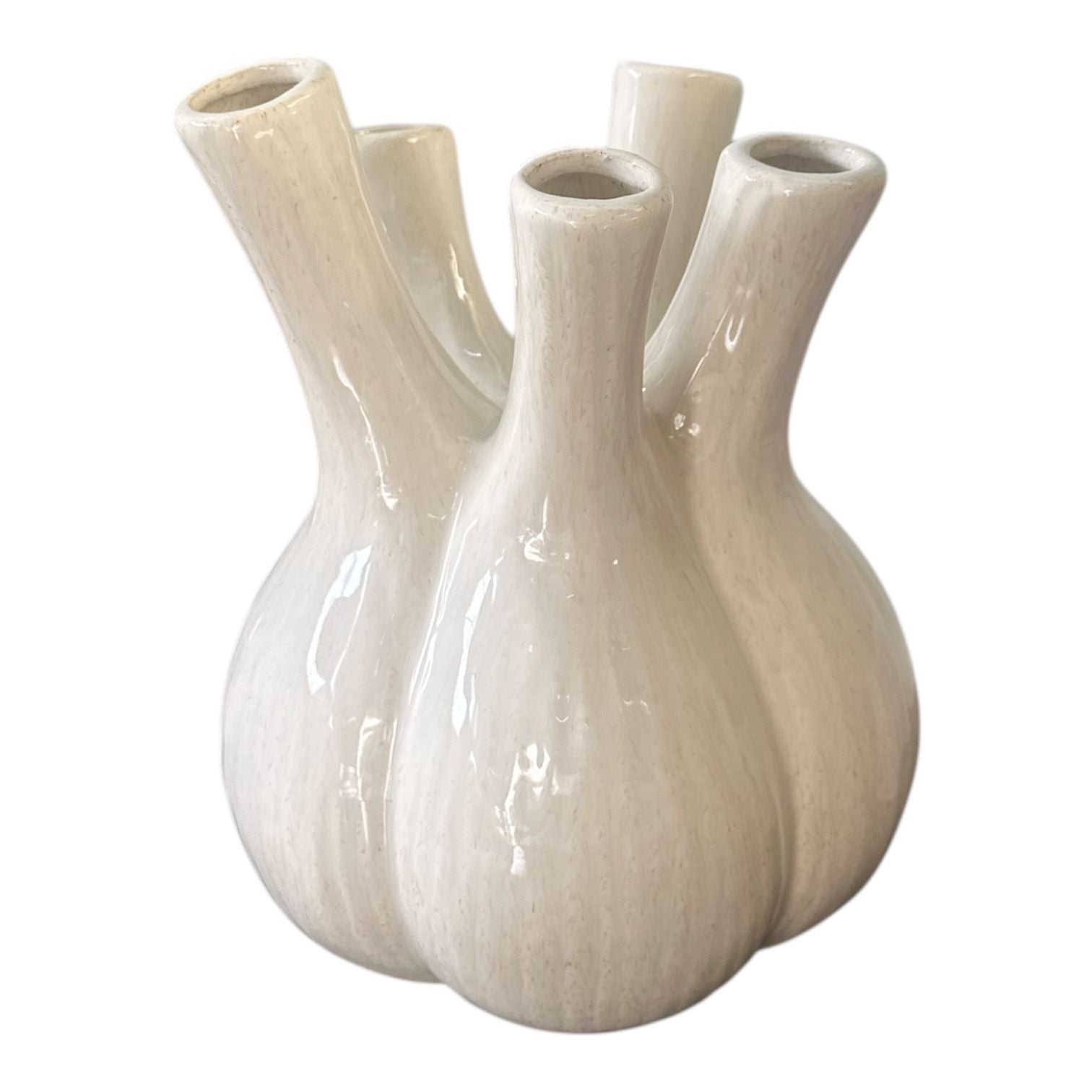Deze tulpenvaas is een echte sfeermaker in huis. De zachte glans en warme witte tint zorgen voor een rustige uitstraling, terwijl de speelse vorm met meerdere tuitjes juist iets bijzonders toevoegt. Met een afmeting van 22x22x28 cm is het een mooie eyecatcher voor op tafel, een dressoir of in de vensterbank.