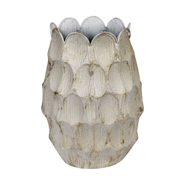 Deze elegante metalen vaas in ivoorwit is een stijlvolle toevoeging aan ieder interieur. Met zijn verfijnde bladstructuur en licht verweerde afwerking heeft hij een rustige, maar karaktervolle uitstraling. De vaas is 26,5x26,5x36,5 cm groot en valt op door zijn unieke vorm.