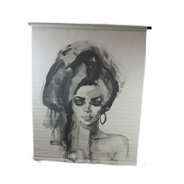 Geef jouw interieur een kunstzinnige en elegante uitstraling met dit prachtige wanddoek. Het ontwerp toont een sfeervol portret van een vrouw, uitgevoerd in zachte grijstinten met een aquarel-achtige uitstraling. De combinatie van de verfijnde lijnen en het mysterieuze karakter van de print maakt dit doek een echte eyecatcher in huis, een salon of horecagelegenheid.