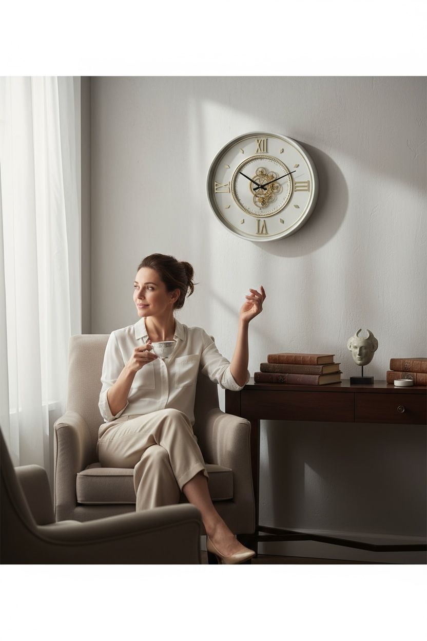 Breng luxe en karakter samen in jouw interieur met de wandklok Lois uitgevoerd in een prachtige off white kleur met een verfijnde gouden wijzerplaat Deze stijlvolle klok is een echte eyecatcher voor iedere ruimte van de woonkamer tot de hal of het kantoor De unieke draaiende tandwielen voegen een speels en dynamisch element toe dat de aandacht trekt en je interieur tot leven brengtDe elegante off white tint zorgt voor een frisse moderne uitstraling terwijl de gouden wijzerplaat een vleugje glamour en luxe toevoegt Of je nu een klassiek modern of bohemian interieur hebt de wandklok Lois biedt een prachtig accent dat moeiteloos in elk decor past Maak een statement in jouw interieur met deze klok die niet alleen de tijd weergeeft maar ook een uniek element aan je wand toevoegtAA-batterij niet inbegrepen